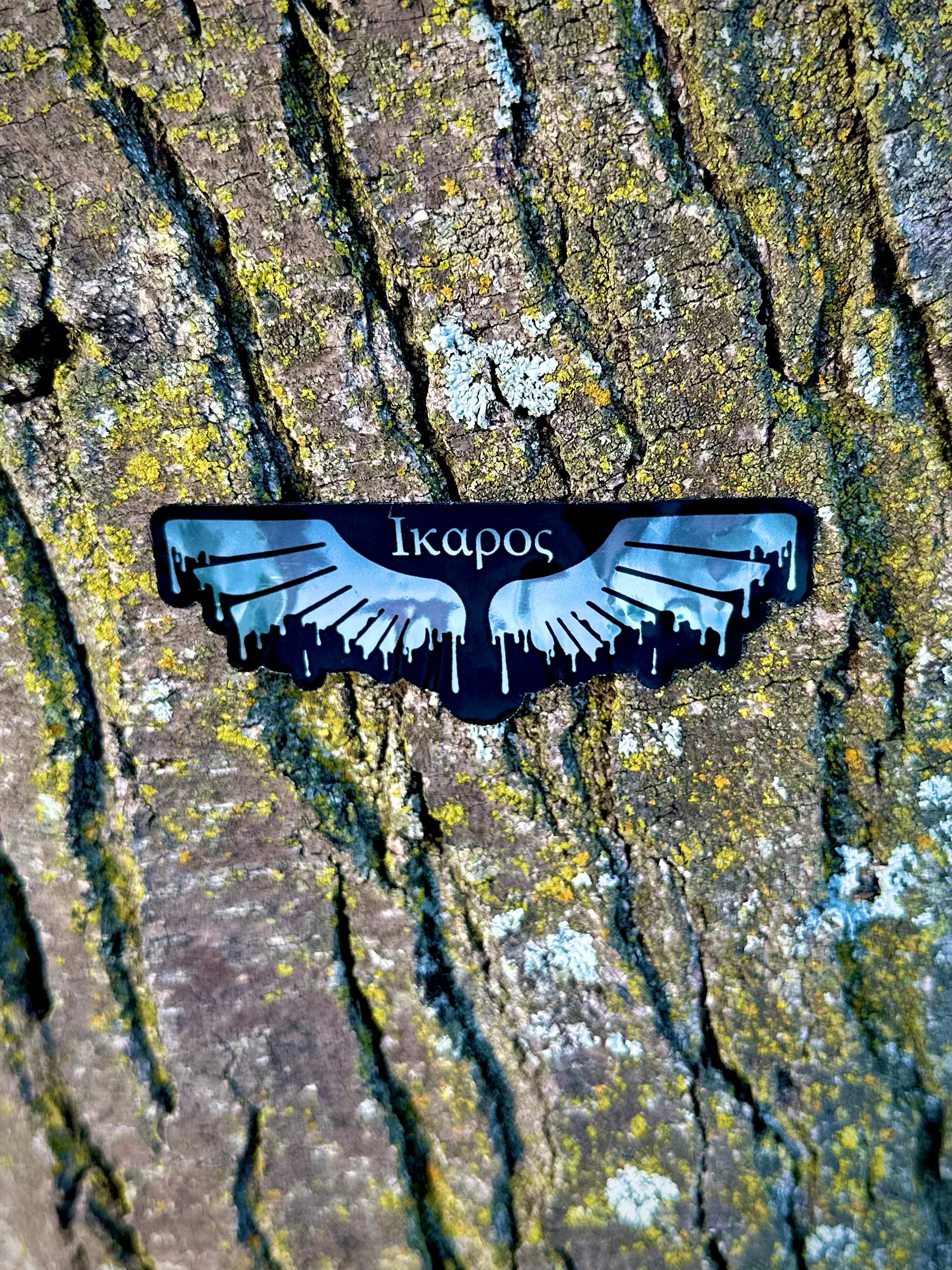 ONE-SIDED, DIE CUT, METALLIC STICKER W/ 'ICARUS' LOGO & 'ICARUS' GREEK SPELLING